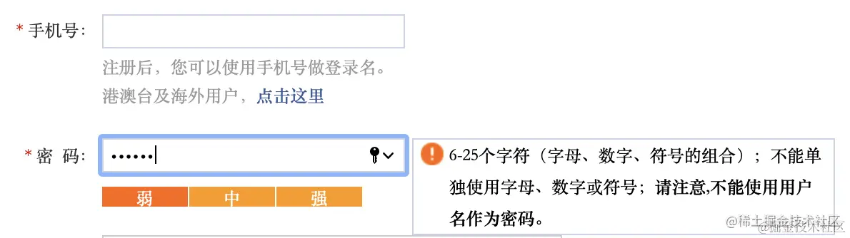 除了这3个基本元素,还有一些可以帮助用户提升效率的其他组成。如下图比较常见的账号注册表单,在设置用户名时若对用户名的格式要求无法在占位符中简短的一句话表述,则可以用底部详细备注的方式给予帮助;如在设置密码时,除了对格式的帮助提示还有对密码强弱度的实时验证反馈;同样对于用户名是否可用,更好的方式也是在该输入框失焦时进行即时的验证,并告知用户更换。