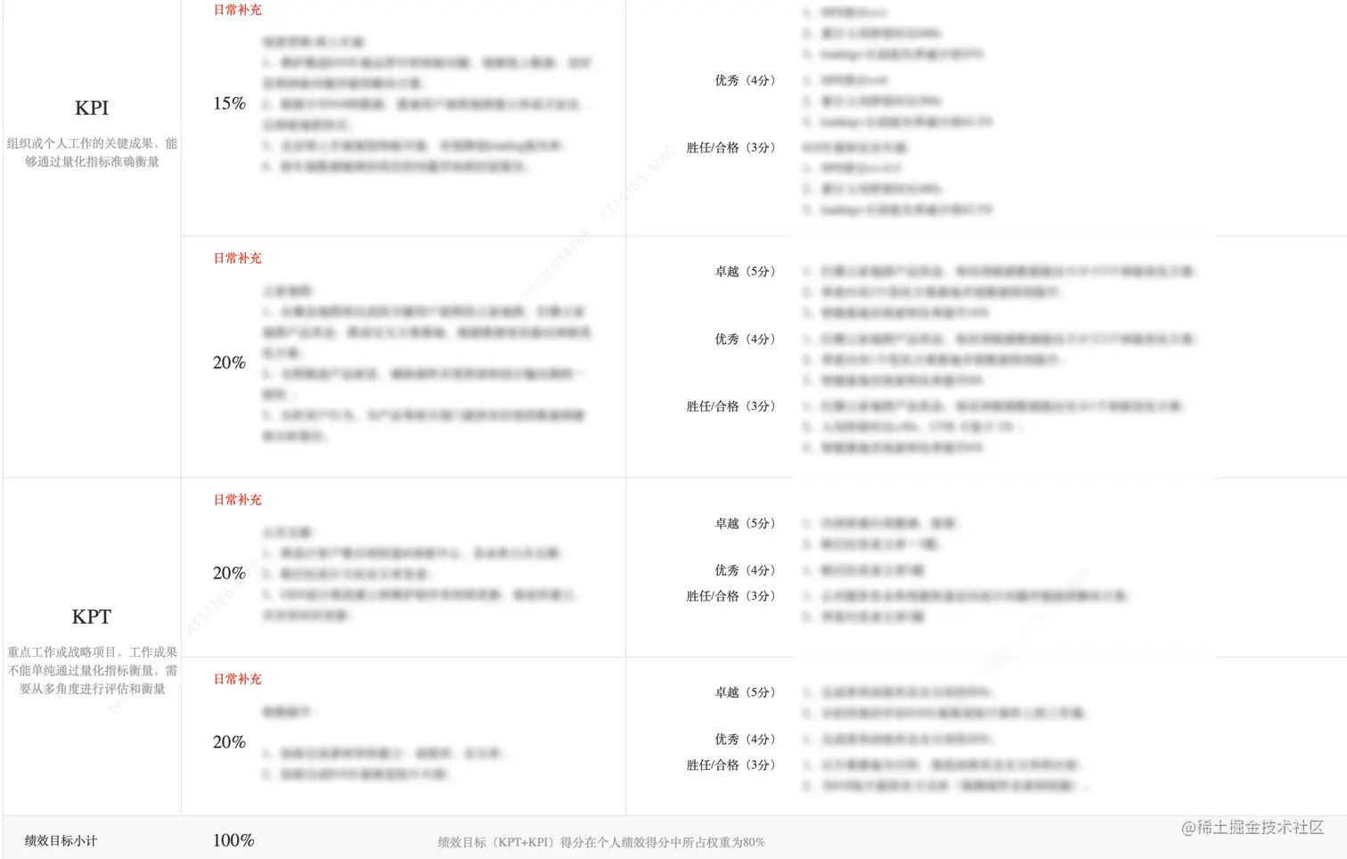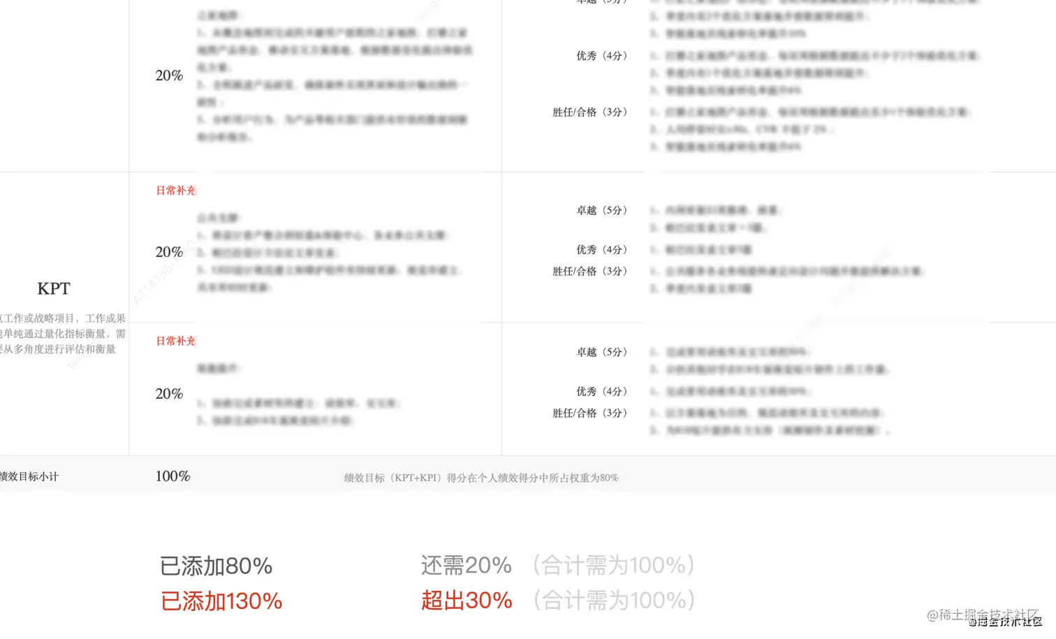 相信每位汽车人小伙伴对这份表单都不会陌生,通常我的填写顺序是先码足文字的部分,在整体评估每个业务占用自己工作量的百分比。经常会出现提交时提示失败,回去一看是绩效目标小计的数字不是100%,然后再看看哪个少点哪个多点,互相匀一匀调整一下数字,直到下面的数字变为100%为止。