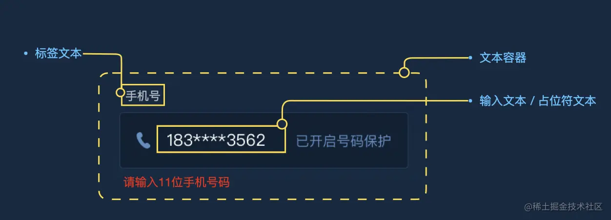 输入框最基本的构成我认为是这3大要素:文本容器、标签文本、输入内容(占位符文本);文本容器决定了组件再页面中的布局,标签文本明确了输入框内所需的信息类型,占位符文本则可对输入内容的类型、字符数等数据要求起到提示作用。