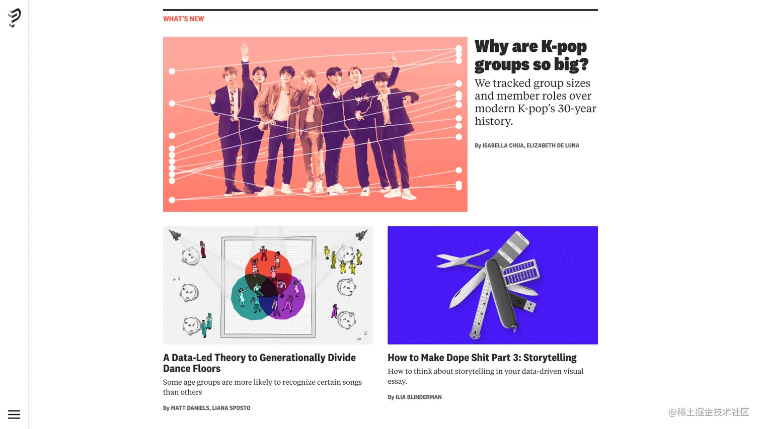 The Pudding 本身完全免费,也没有扰人的广告,那团队是怎么活下来的呢?同一拨人有另一个商业化产品 The Polygraph ,接受定制化项目合作,The Pudding 便是一个团队能力展示板和探索空间。