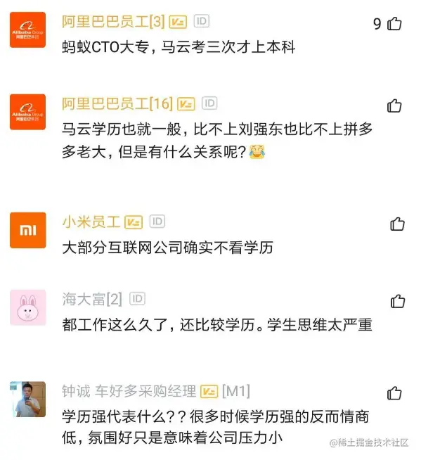 还有许多网友说学历高低也不说明什么,马云学历也一般,但也不妨碍人家当首富。大部分互联网公司都不看学历,因为英雄不问出处,何况有时候学历高的人情商反而低。