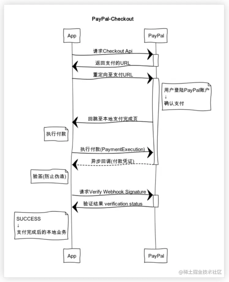 流程其实就是,前端请求服务端支付接口,服务端构建支付并发给paypal服务器,paypal服务器会返回支付链接给服务端,服务端拿到paypal返回的支付链接后返回给前端,前端跳转到支付链接给用户确认支付,用户点击确认支付后返回到服务端设置的地址,随后,然后paypal会发送异步回调过来,到时做验签然后检验结果看是否完成,如果完成则修改订单状态。