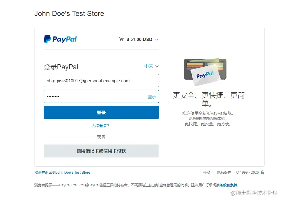 如果你没有登录,会看到这个页面,注意这里是使用沙箱的测试买家账号登录,不要用卖家账号登录,而且因为我的测试买家的地址设置在了美国,所以是英文,如果你创建的买家账号是日本的,这里就会显示日文