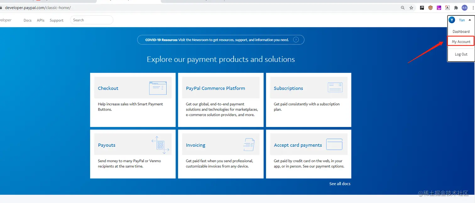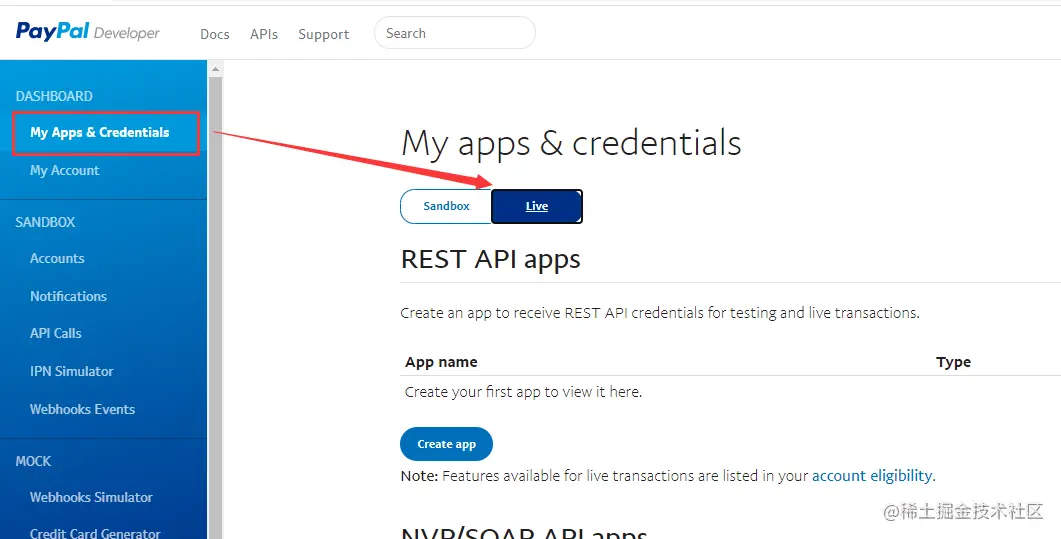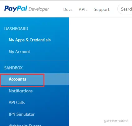 2.注册完登录后,进入开发者中心(developer.paypal.com/)可以进入沙箱账号
