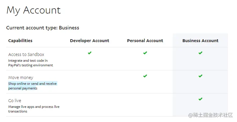 一、前期准备: 先去paypal官网注册账号(账号有三个等级:开发者账号,个人账号,企业账号,沙箱模式是三种账号都有的,但有些功能是高等级的账号才有,具体区别看下图),然后paypal会有一个沙箱模式,在开发阶段我们可以使用沙箱账号来进行测试,主要步骤如下: 1.首先去官网注册一个paypal账号,因为我做项目的时候是客户注册好的一个企业账号,所以这一步我省略,企业账号是最高等级的账号。