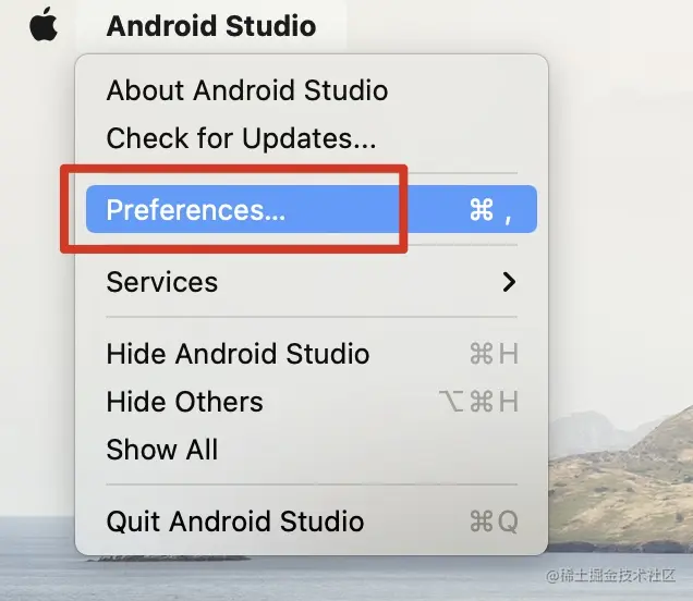 1. 打开Android Studio,点击左上角,选择Preferences