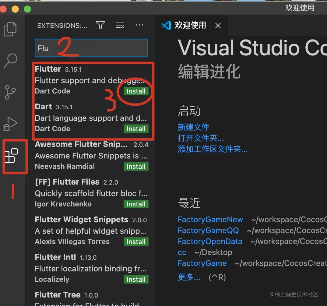 1. 打开VSCode,分别搜索Flutter和Dart