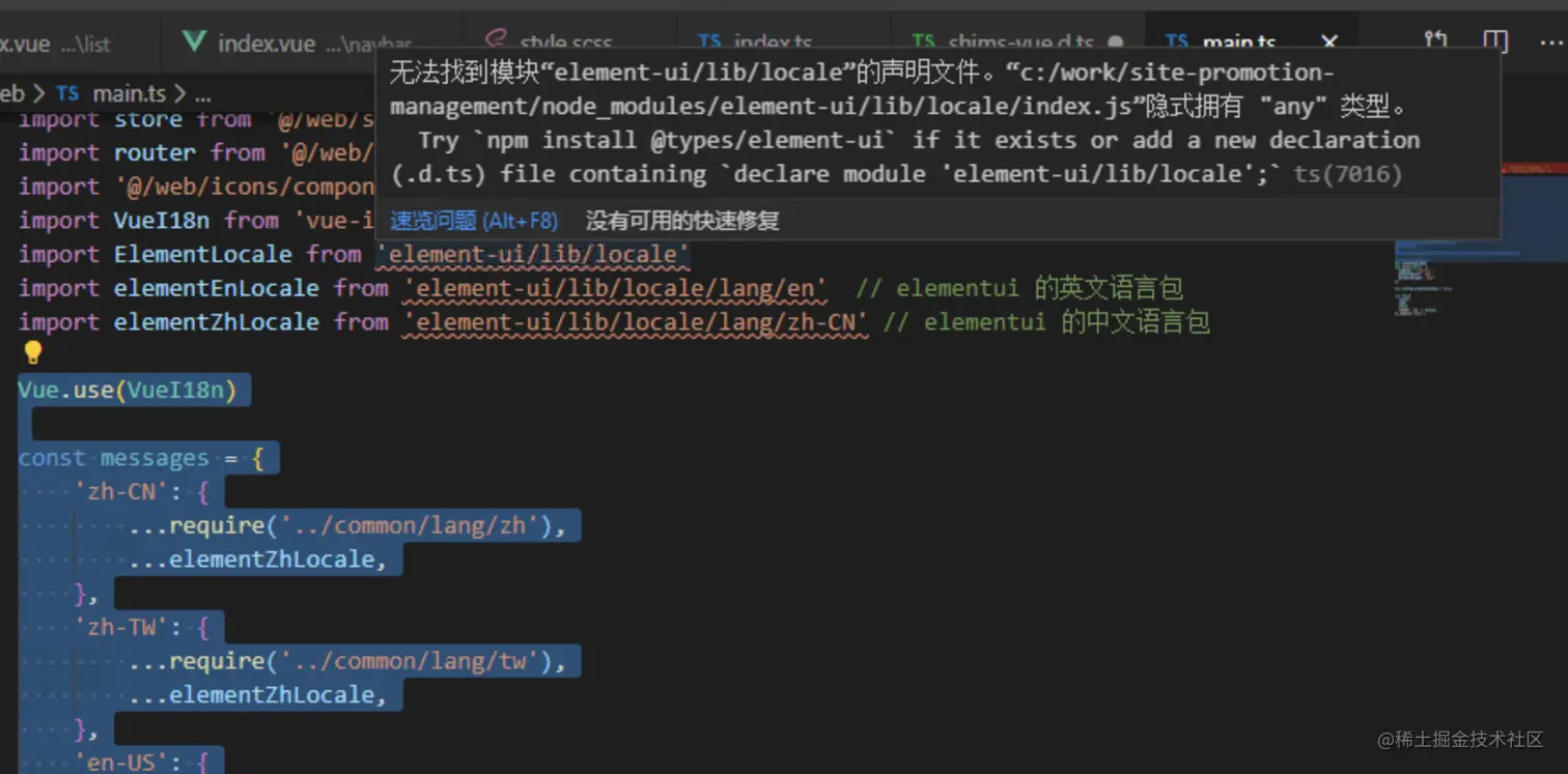 然后呢,我们在main.js里面引用,由于elementUI是用的js写的,所以如果小伙伴们用的是ts,需要手动配置一个.d.ts文件,否则会这样