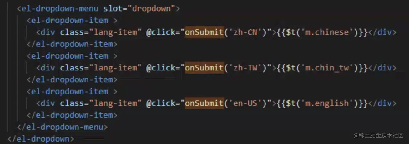 我们需要把所有需要翻译的文本写入相应的文件里面,然后我在navbar组件里面定义了相应的切换语言的方法。