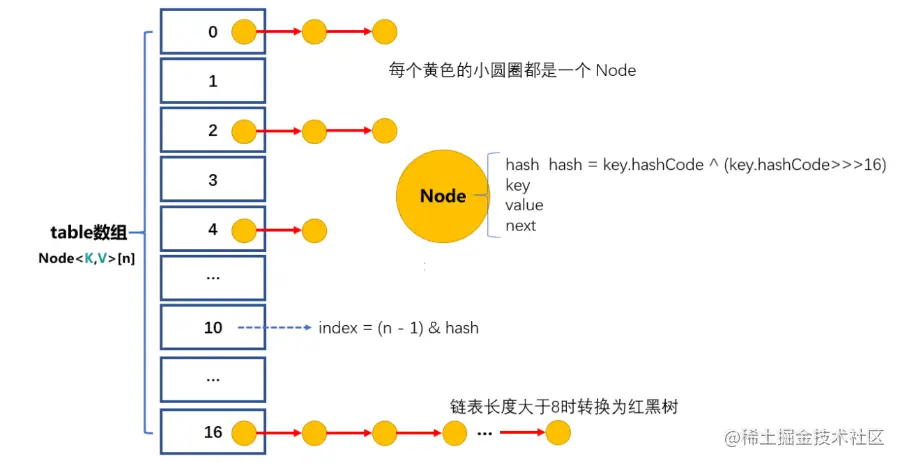 数组里面都是key-value的实例,在JDK1.8之前叫做Entry,在JDK1.8之后叫做Node。