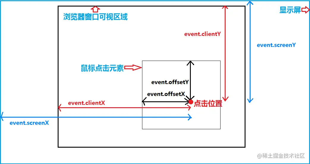 简单代码即可实现,然而这是还不够,因为绝大多数情况下我们希望获取鼠标点击位置相对于浏览器窗口的坐标,event的clientX,clientY属性分别表示鼠标点击位置相对于文档的左边距,上边距。于是类似的我们写出了这样的代码.