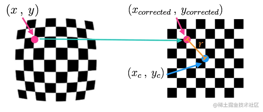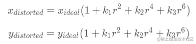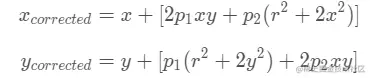 之后,我们将使用 cv2.calibrateCamera()来求解畸变系数。修正径向畸变需要三个系数: k1,k2,k3;而修正切向畸变需要两个系数: p1,p2。计算畸变点坐标的公式如下所示,其中 r 是未畸变图像中某点与图像畸变中心之间的已知距离,而该中心通常就是图像的中心 (x_c,y_c)