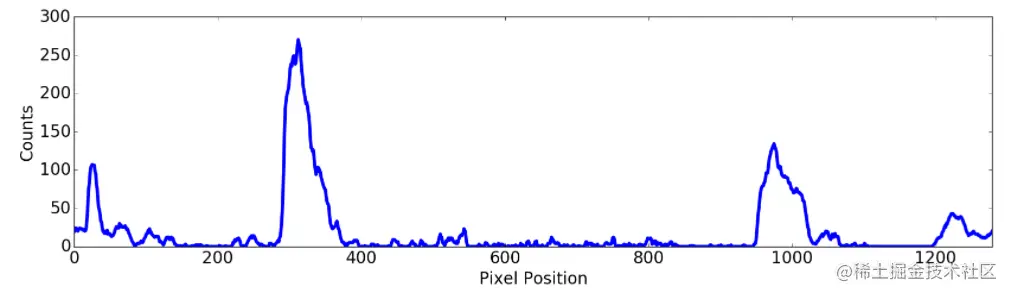 首先,我对图像下半部分的所有列都做了一个直方图。在我们的阈值化二值图像中,像素要么是0,要么是1,所以这个直方图中最突出的两个峰值将很好地指示车道线基线的 x 位置。