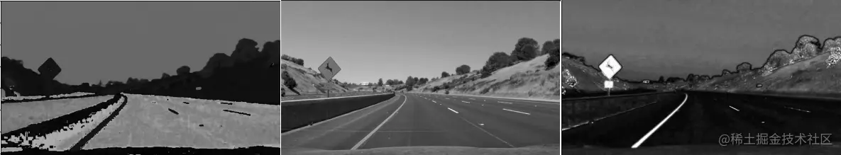 车道线的颜色是白色和黄色,并且两者都有特定范围内的饱和度值。因此,我只选择饱和度值在这个范围之间的像素。通过过滤掉明度值较小的像素点,可以在明度信道中检测出白色。