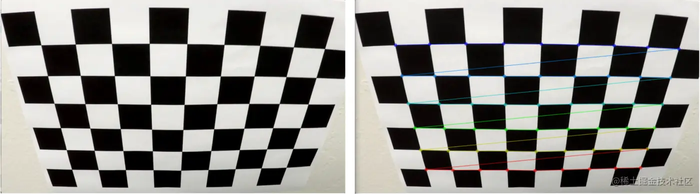 为了校准摄像头,我们可以拍摄已知形状的照片,并纠正任何畸变的错误。这项任务最常见的目标是棋盘,因为它的高对比度模式。