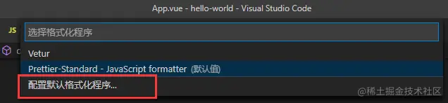 - 选择配置默认格式化程序,选择 Prettier-Standard - JavaScript formatter