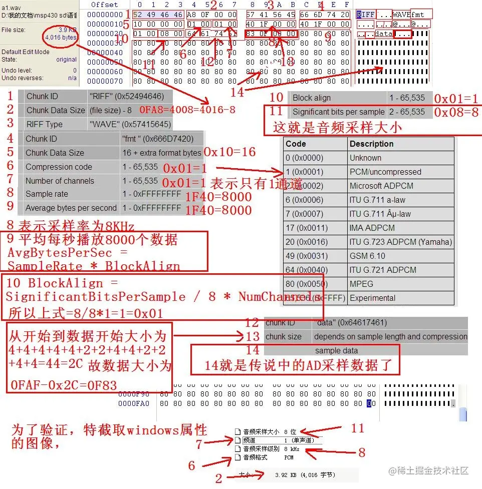 这个示例中的fmt块没有额外数据,连字段cbSize也没有,所以fmt块的chunkSize是16,比上面介绍的WAVEFORMATEX结构体少了2个字节的cbSize。
