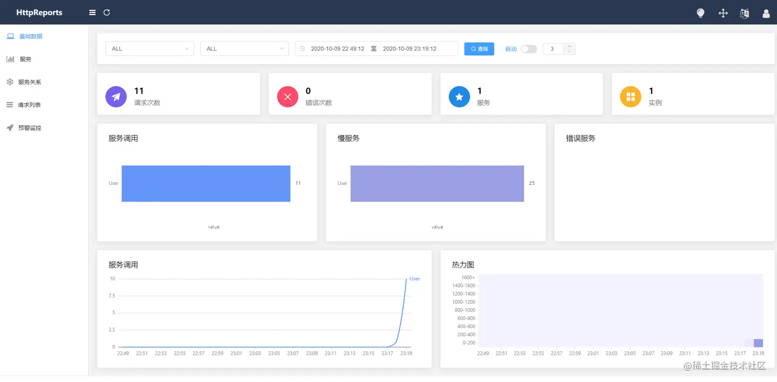 刷新下 UserService 的接口,再回到Dashboard的页面上面,已经可以看到数据了,一个简单的服务接入HttpReports,已经完成了,是不是很简单!