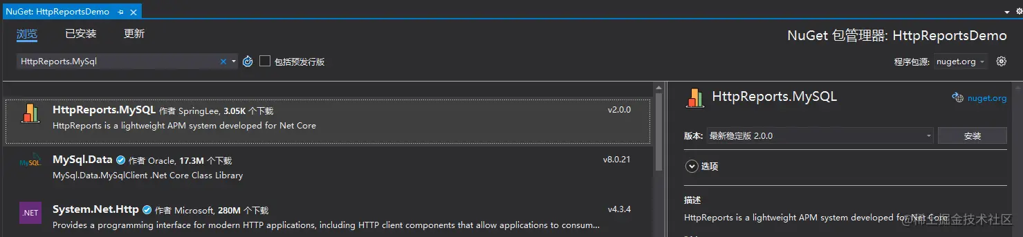 新建完成后,通过Nuget包分别安装 HttpReports.Dashboard ,HttpReports.MySQL(或者是HttpReports.SqlServer, HttpReports.PostgreSQL)