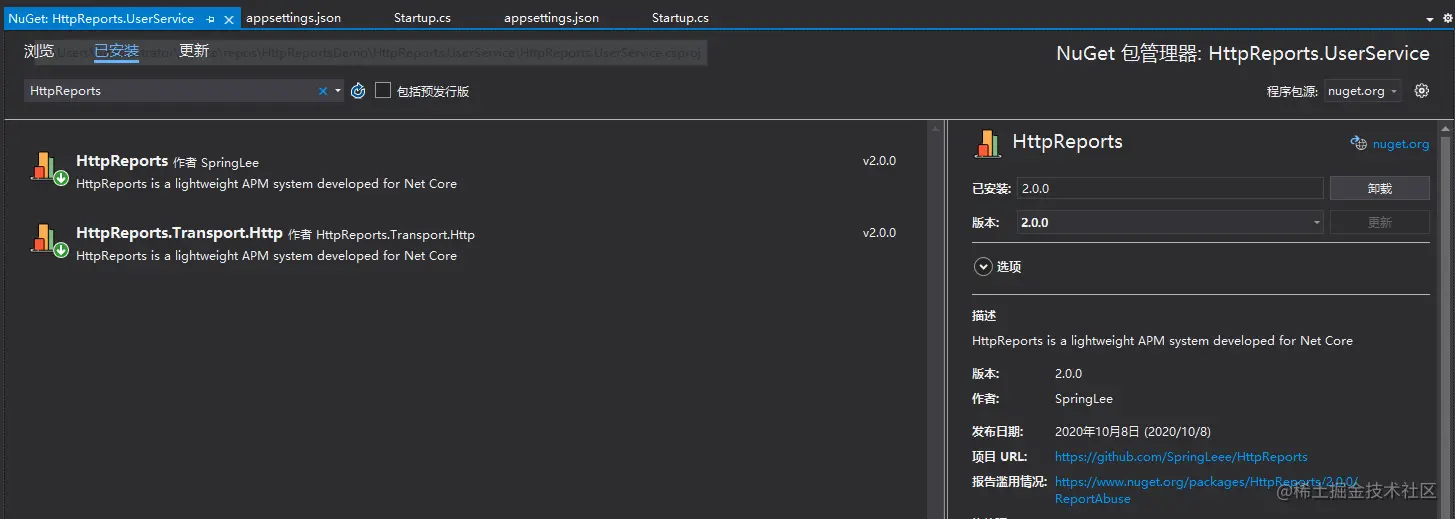我新建一个WebAPI 项目 UserService ,来充当用户服务,然后安装 HttpReports,当然你可以在你的项目中直接使用