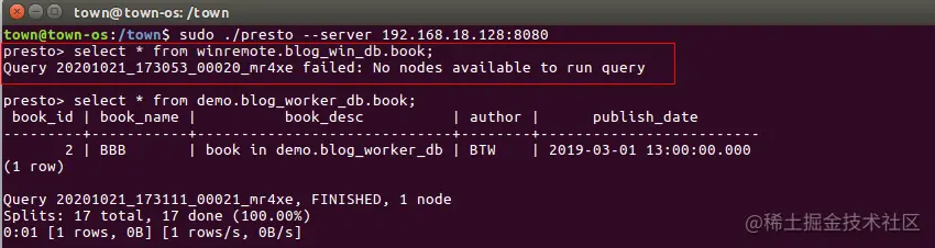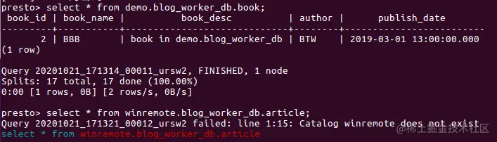 presto定位1个表的完整信息格式:catalog配置文件名.database.schema。比如访问机器1blog_worker_db数据库下book表,需要以demo.blog_worker_db.book形式访问。