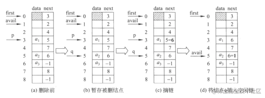 SList[q].next = avail; // 将结点q插在空闲链avail的最前端
