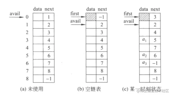 静态链表用数组来表示链表,用数组元素的下标来模拟链表的指针。由于利用数组定义的链表,属于静态存储分配,因此叫作静态链表。最常用的时静态单链表,在不致混淆的情况下,将静态单链表简称为静态链表,存储示意图如下图所示,其中avail是空闲链表(全部由空闲数组单元组成的单链表)头指针,first是静态链表的头指针,为了运算方便,静态链表也带头指针。