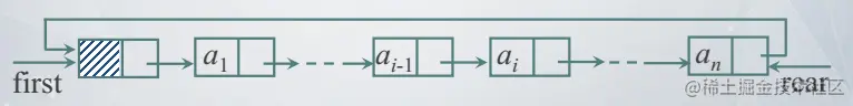 在单链表中,如果将终端结点的指针由空指针改为指向头结点,就使得整个单链表形成一个环,这种头尾相接的单链表称为循环单链表(circular singly linked list),在用头指针指示的循环单链表中,找到开始结点的时间为O(1),但找到终端结点的时间为O(n),如果改用指向终端结点的尾指针来指示循环单链表,那寻找开始结点以及终端结点的时间都为O(1),它们的存储地址分别为rear->next->next和rear,显然时间都为O(1)。因此,实际应用中多采用尾指针指示的循环单链表。