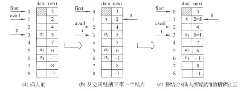 avail = SList[avail].next; // 空闲链的头指针后移