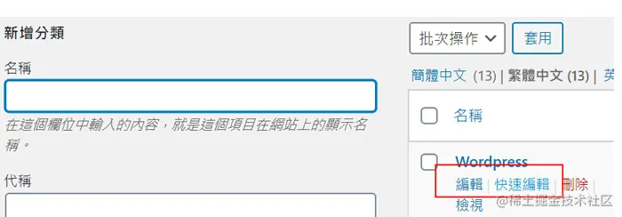 第一可以去管理分类(Categories)版面,然后在分类标题下面点击快速编辑(quick edit),之后在代称格里改就可以了,最后别忘了按更新。另一个方法就是直接按编辑分类,然后改分类代称。