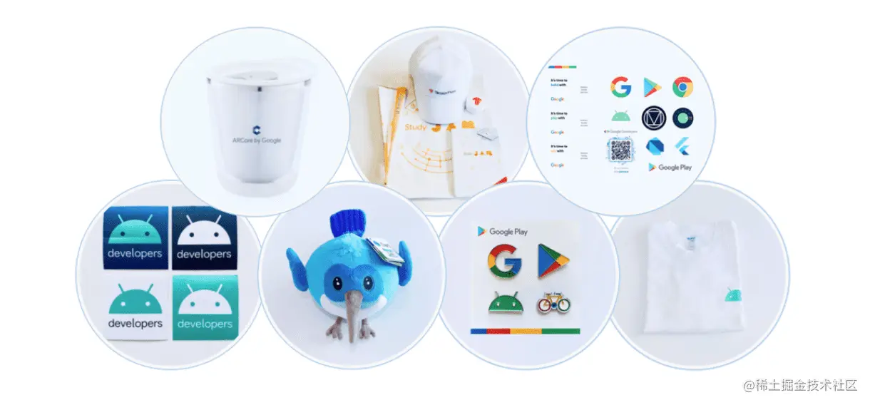 谷歌开发者大礼包: Android 贴纸和 T 恤、ARCore 水杯、Flutter Dash 玩偶、Google Play 胸针组合、TensorFlow 礼品袋 (帽子/笔记本/扇子/悠悠球)、谷歌开发者贴纸