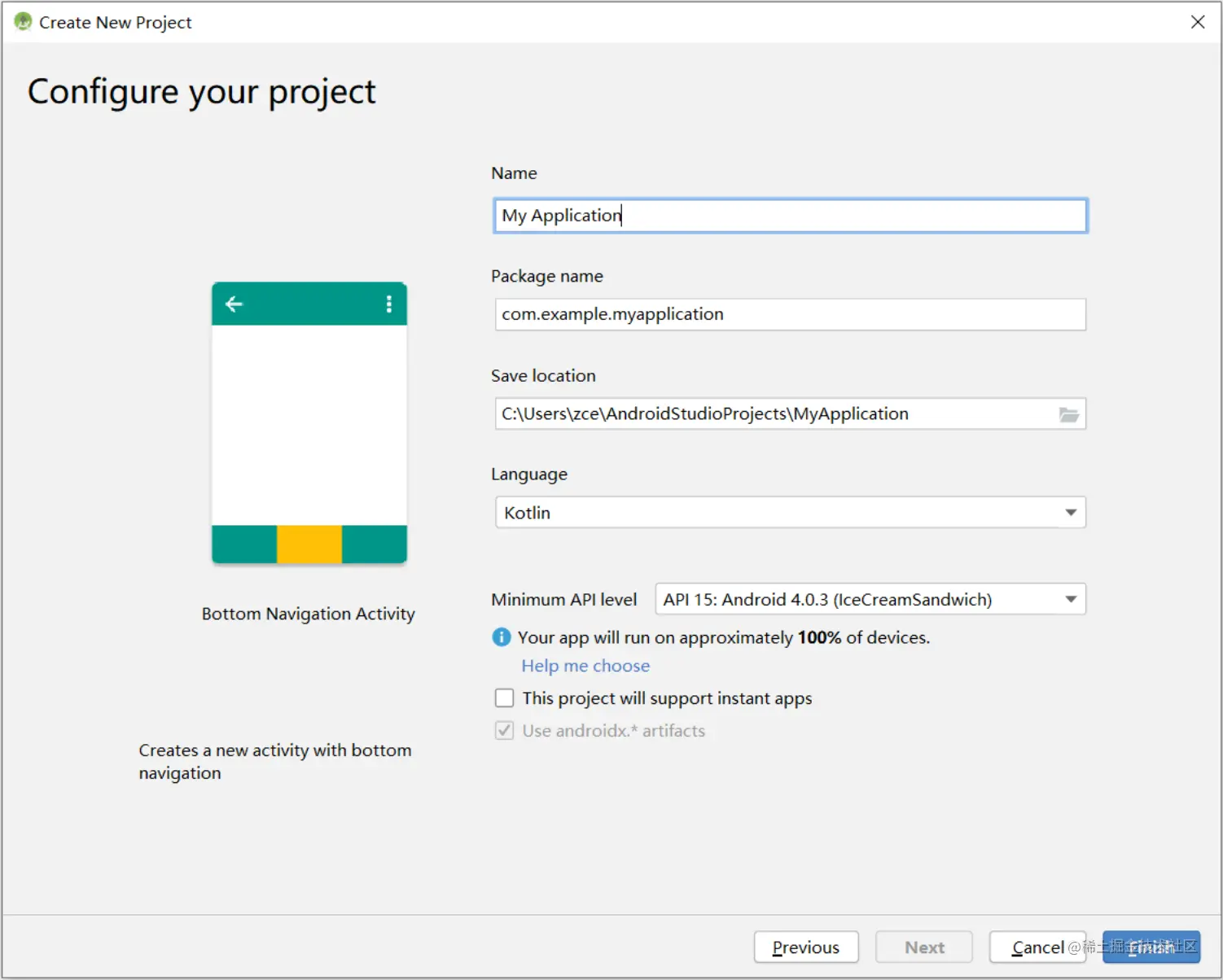 从点击创建新项目开始就进入了Android Studio脚手架工作流程,我们可以先去选择类型,再去填写项目相关的一些属性和配置,最后就可以得到一个安卓项目最基础的骨架,这里面默认的一些代码和结构都会自动去帮我们去生成。