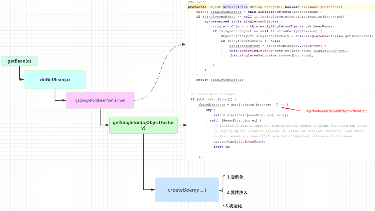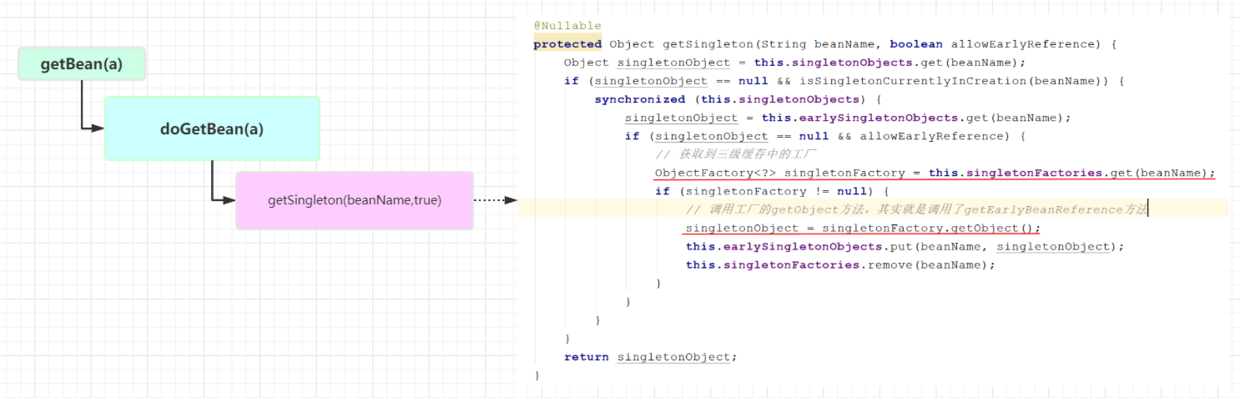 因为B需要注入A,所以在创建B的时候,又会去调用getBean(a),这个时候就又回到之前的流程了,但是不同的是,之前的getBean是为了创建Bean,而此时再调用getBean不是为了创建了,而是要从缓存中获取,因为之前A在实例化后已经将其放入了三级缓存singletonFactories中,所以此时getBean(a)的流程就是这样子了