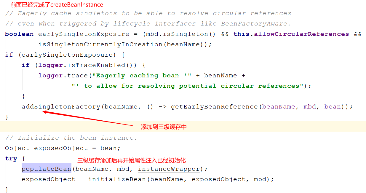 看到了吧,即使没有循环依赖,也会将其添加到三级缓存中,而且是不得不添加到三级缓存中,因为到目前为止Spring也不能确定这个Bean有没有跟别的Bean出现循环依赖。