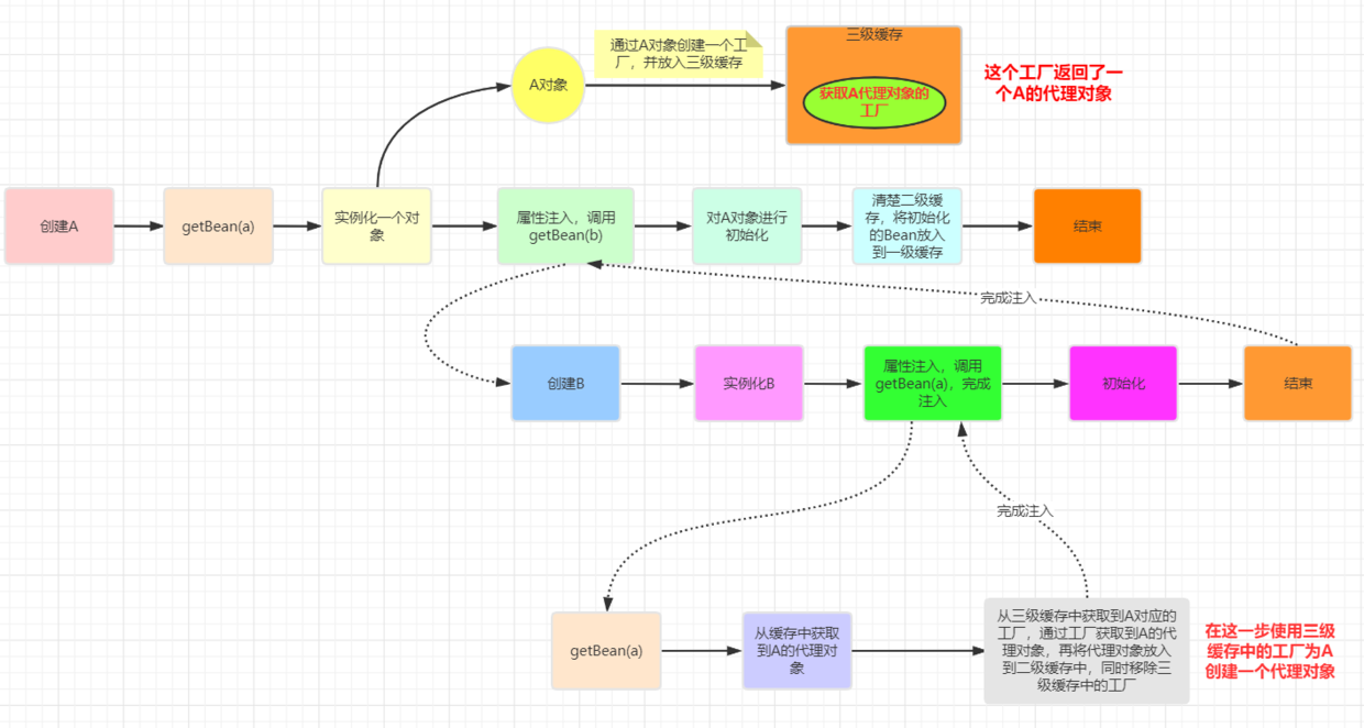 上面两个流程的唯一区别在于为A对象创建代理的时机不同,在使用了三级缓存的情况下为A创建代理的时机是在B中需要注入A的时候,而不使用三级缓存的话在A实例化后就需要马上为A创建代理然后放入到二级缓存中去。对于整个A、B的创建过程而言,消耗的时间是一样的