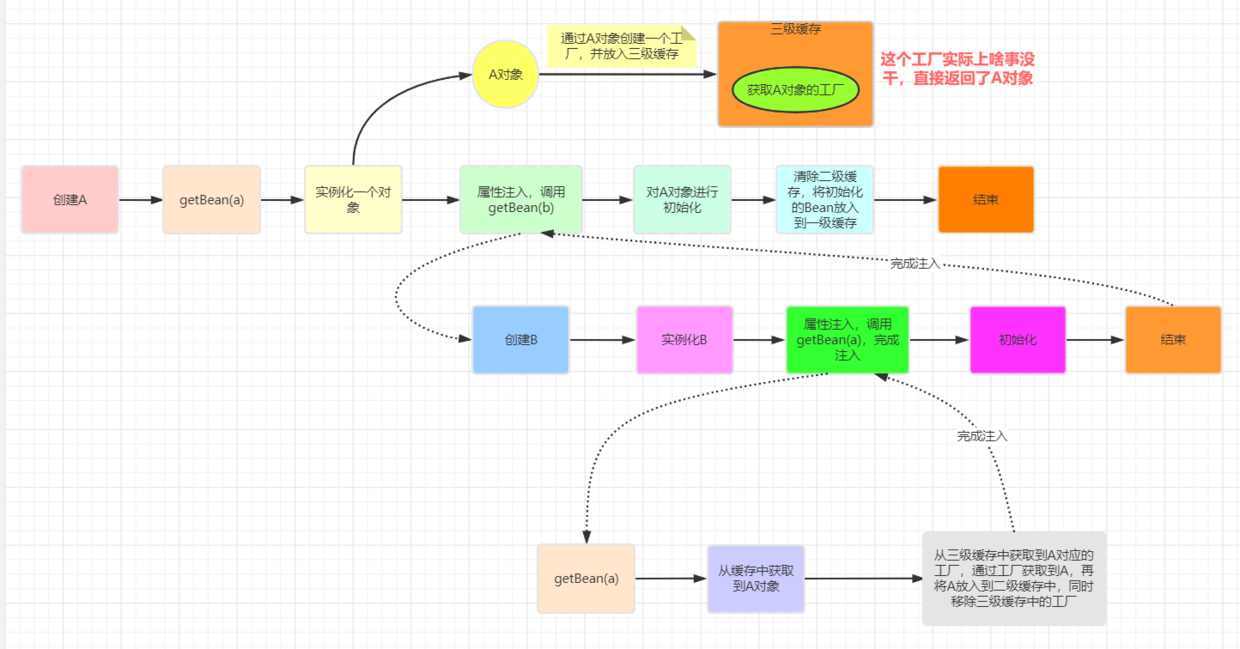 从上图中我们可以看到,虽然在创建B时会提前给B注入了一个还未初始化的A对象,但是在创建A的流程中一直使用的是注入到B中的A对象的引用,之后会根据这个引用对A进行初始化,所以这是没有问题的。