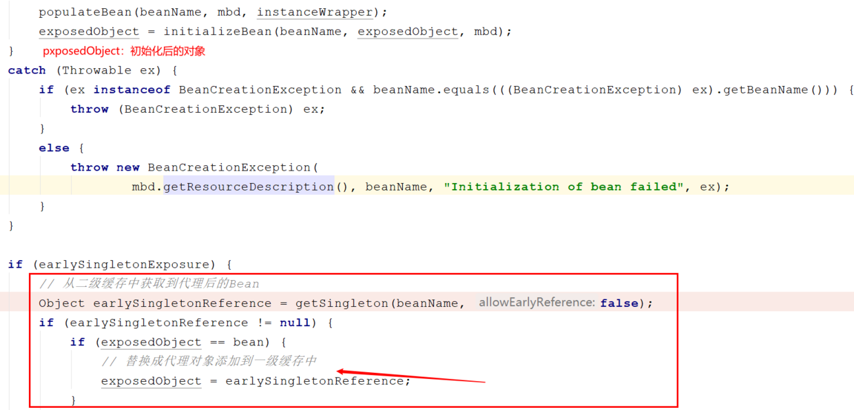 它实际上就是调用了后置处理器的getEarlyBeanReference,而真正实现了这个方法的后置处理器只有一个,就是通过@EnableAspectJAutoProxy注解导入的AnnotationAwareAspectJAutoProxyCreator。也就是说如果在不考虑AOP的情况下,上面的代码等价于: