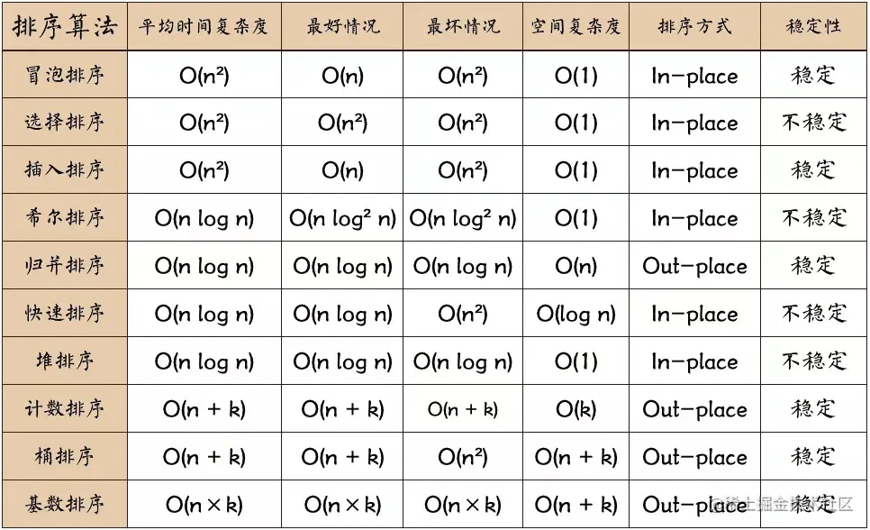 图中有各种排序算法的时间复杂度、空间复杂度、排序方式和稳定性。