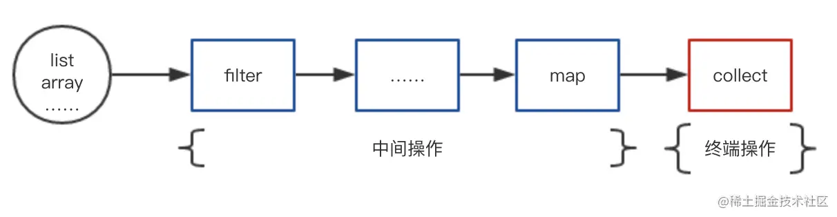 Stream操作可以像Builder一样逐步叠加,形成一条流水线。流水线一般由数据源+零或者多个中间操作+一个终端操作所构成。中间操作可以将流转换成另外一个流,比如使用filter过滤元素,使用map映射提取值。