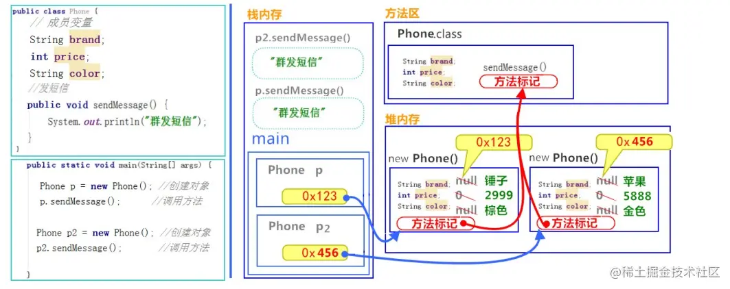 对象调用方法时,根据对象中方法标记(地址值),去类中寻找方法信息。这样哪怕时多个对象,方法信息只保存一份,节约内存空间。