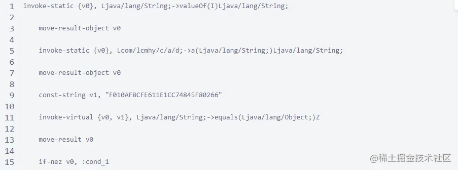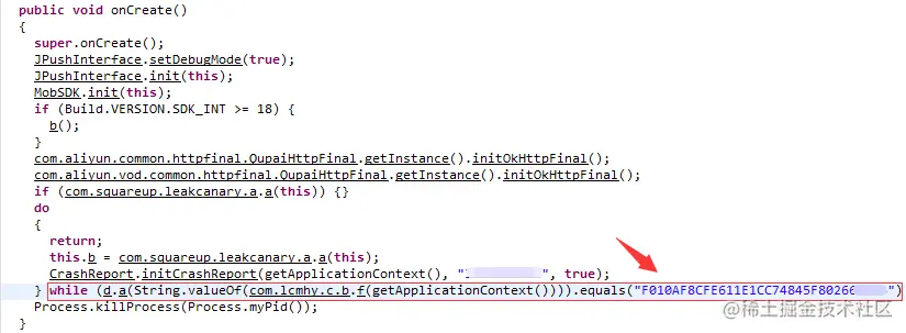 通过上面的语句我们可以知道,这只是一个简单的equals()比较,之后我们打开相应的smali文件,搜索"F010AF8CFE611E1CC74845F80266",定位签名校验的反编译代码位置