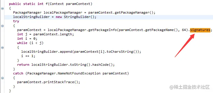一般java层面的签名校验都离不开signatures来获取签名信息,所以我们可以在jd-gui中全局搜索signatures关键字,找到获取签名的方法,当然如果app在校验失败前有着特殊的Toast提示或者Log信息那就更方便了