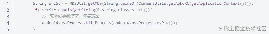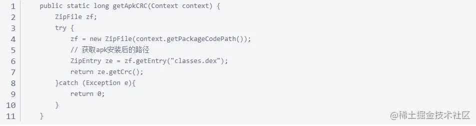 通常重编译apk就是重编译classes文件,而代码重新编译后,生成的classes.dex文件的Hash值就会改变,所以我们可以检查程序安装后classes.dex文件的Hash值来判断软件是否被重新打包过。至于Hash算法MD5和CRC都可以,在这里就直接使用CRC算法获取当前运行的app的crc32值了
