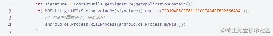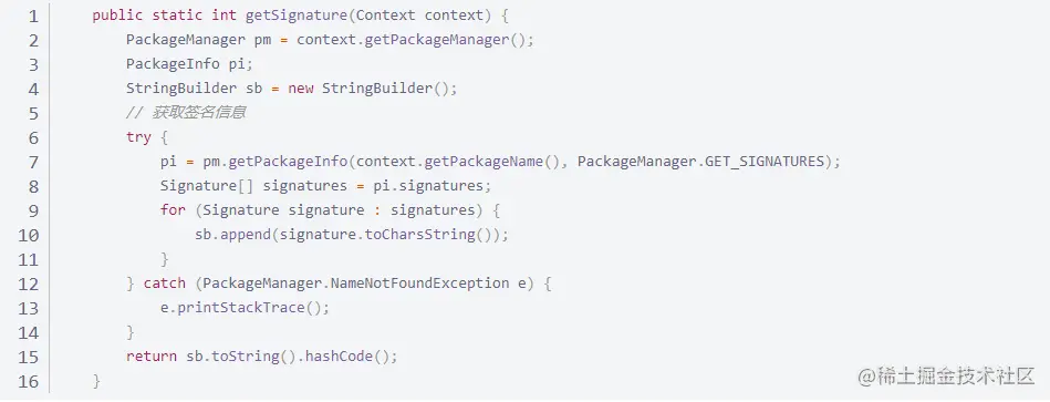 在这里简单介绍下,纯java逻辑的签名校验方法,Android SDK中提供了检测软件签名的方法,我们可以使用签名对象的hashCode()方法来获取一个Hash值,在代码中比较它的值即可,下面是获取当前运行时的签名信息代码