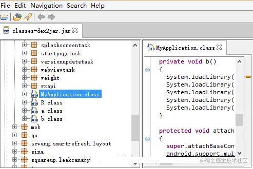 然后我们通过dex2jar和jd-gui得到反编译出的java代码(往往都是已混淆的),不熟悉步骤的可以先去查看 上篇博客,这两种方式相辅相成,通过查看Java代码我们可以快速搜索出需要的Android API方法,再通过API方法的位置来定位到相应smali文件的大概位置