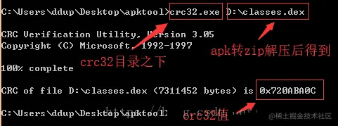 当打包成功后,我们获取apk的classes.dex的crc32值,随后将该crc32值赋予R.string.classes_txt,最后通过AndroidStudio再重新打包即可(因为更改资源文件并不会改变classe.dex的crc32值,改变代码才会)。获取classes.dex的crc32值的方法,我推荐使用 Windows CRC32命令工具 ,提取码: 5xkc,使用方法如下