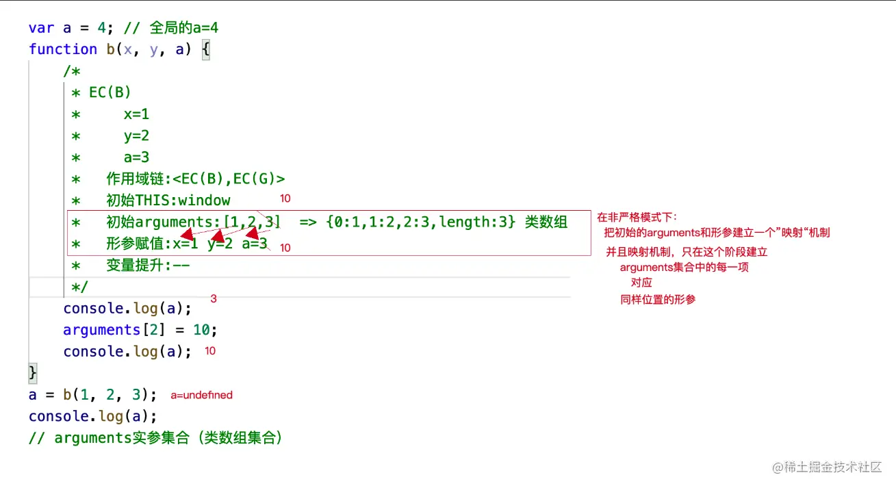 * (在非严格模式下:把初始化的arguments和形参建立一个“映射”机制,只在这个阶段建立。 arguments集合中的每一项对应同样位置的形参)