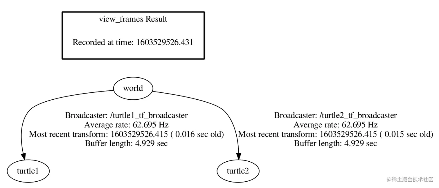 rosrun tf tf_echo turtle1 turtle2查看两只海龟之间坐标变换关系rosrun rviz rviz -d 'rospack find turtle_tf' /rviz/turtle_rviz.rviz更直观显示两只海龟间坐标变换关系