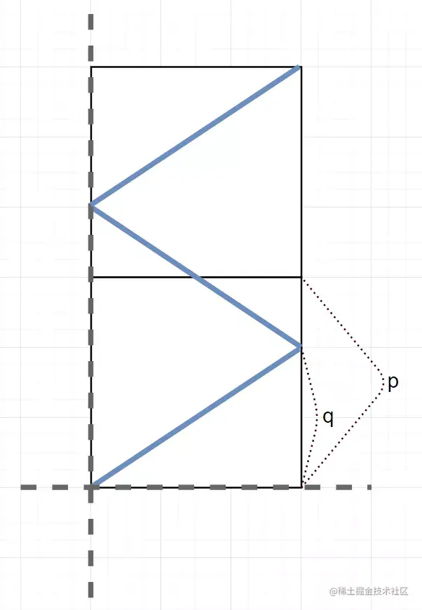 但是如果我们把光线的运动轨迹拆开来看,就可以观测到,光线每经过一次折反,都会在纵向距离上移动 q(首次与东墙相距的距离)。同时,一旦其向上行走的距离为 p 的整数倍,就一定会碰到某个接收点(注意:这里我们不需要考虑北面墙是否存在,根据光的反射定律可得)可以参考一下下面这张图: