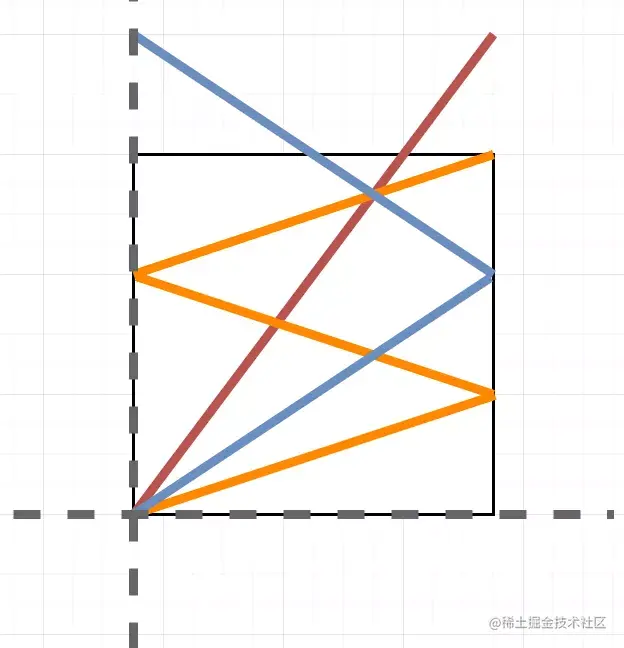 我们知道光是由西南角发出的,也就是左下角。发出之后可能会出现多种情况(注意,下图略过了部分光线反射的情况)。看起来是十分复杂,无迹可寻。